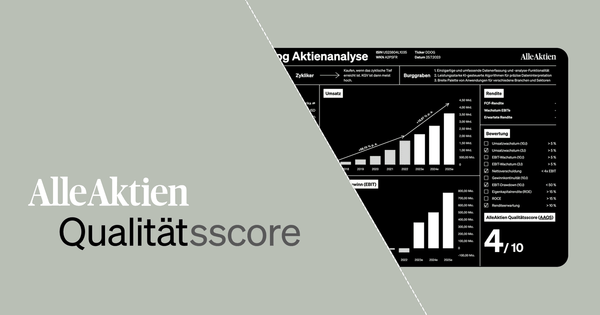 Genau hier entfalten die Analysen von AlleAktien und der AlleAktien-Qualitätsscore (AAQS) ihre Wirkung. Statt sich auf Meinungen, Stimmungen oder kurzfristige Kursbewegungen zu verlassen, erhalten Anleger ein systematisches Werkzeug zur Aktienauswahl. Jede Analyse folgt einer klaren Struktur und bewertet Unternehmen konsequent nach Qualität, Wirtschaftlichkeit und langfristiger Ertragskraft.